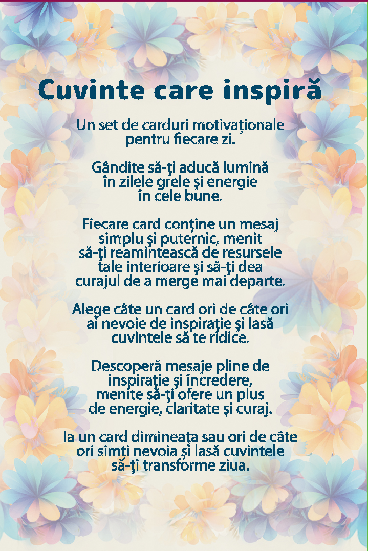 „Cuvinte care inspiră” Un set de carduri motivaționale pentru fiecare zi. Gândite să-ți aducă lumină în zilele grele și energie în cele bune. Fiecare card conține un mesaj simplu și puternic, menit să-ți reamintească de resursele tale interioare și să-ți dea curajul de a merge mai departe. Alege câte un card ori de câte ori ai nevoie de inspirație și lasă cuvintele să te ridice. Descoperă mesaje pline de inspirație și încredere, menite să-ți ofere un plus de energie, claritate și curaj. Ia un card dimineața sau ori de câte ori simți nevoia și lasă cuvintele să-ți transforme ziua.